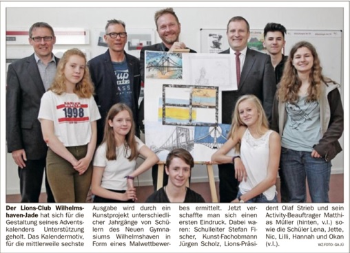 Der Lions-Club Wilhelmshaven-Jade hat sich für die Gestaltung seines Adventskalenders Unterstützung geholt. Das Kalendermotiv, für die mittlerweile sechste Ausgabe wird durch ein Kunstprojekt unterschiedlicher Jahrgänge von Schülern des Neuen Gymnasiums Wilhelmshaven in Form eines Malwettbewerbes ermittelt. Jetzt verschaffte man sich einen ersten Eindruck. Dabei waren: Schulleiter Stefan Fischer, Kunst-Fachobmann Jürgen Scholz, Lions-Präsident Olaf Strieb und sein Activity-Beauftragter Matthias Müller (hinten v.l.) sowie die Schüler Lena, Jette, Nic, Lilli, Hannah und Okan (v.l.).
