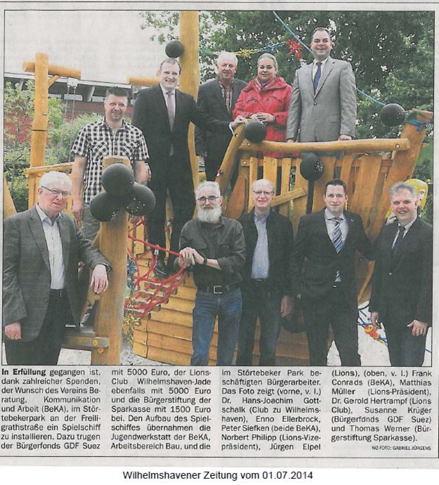 In Erfüllung gegangen ist, dank zahlreicher Spenden, der Wunsch des Vereins Beratung, Kommunikation und Arbeit (BeKA), im Störtebeker Park and er Freiligrathstraße ein Spielschiff zu installieren. Dazu trugen der Bürgerfonds GDF Suez mit 5.000 Euro, Der Lions-Club Wilhelmshaven-Jade ebenfalls mit 5.000 Euro und die Bürgerstiftung der Sparkasse mit 1.500 Euro bei. Den Aufbau des Spielschiffes übernahmen die Jugendwerkstatt der BeKA, Arbeitsbereich Bau, und die im Störtebeker Park beschäftigten Bürgerarbeiter.