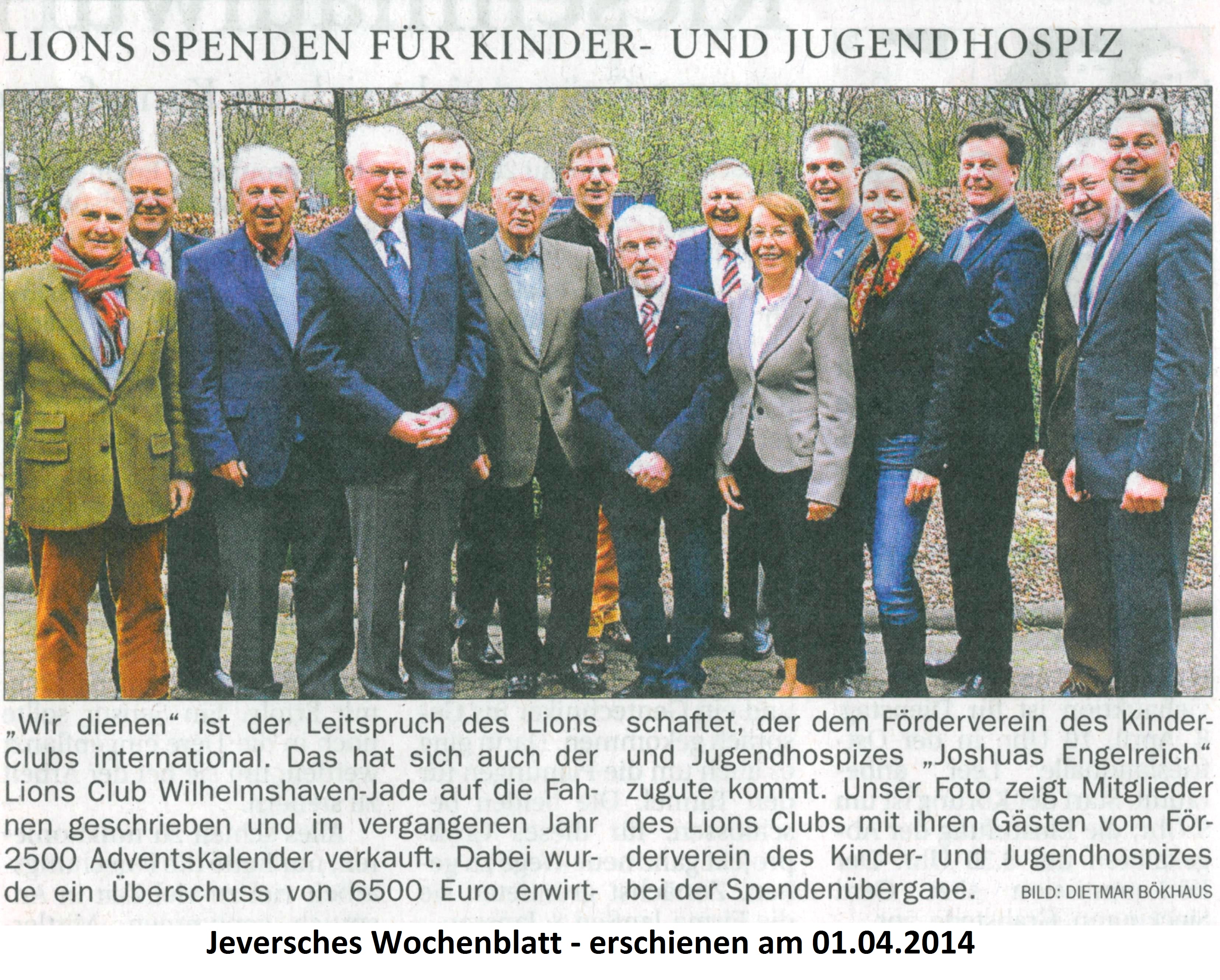 „Wir dienen“ ist der Leitspruch des Lions Clubs International. Das hat sich auch der Lions Club Wilhelmshaven-Jade auf die Fahnen geschrieben und im vergangenen Jahr 2500 Adventskalender verkauft. Dabei wurde ein Überschuss von 6500 Euro erwirtschaftet, der dem Förderverein des Kinder- und Jugendhospizes „Joshuas Engelreich“ zugute kommt. Unser Foto zeigt Mitglieder des Lions Clubs mit ihren Gästen vom Förderverein des Kinder- und Jugendhospizes bei der Spendenübergabe.