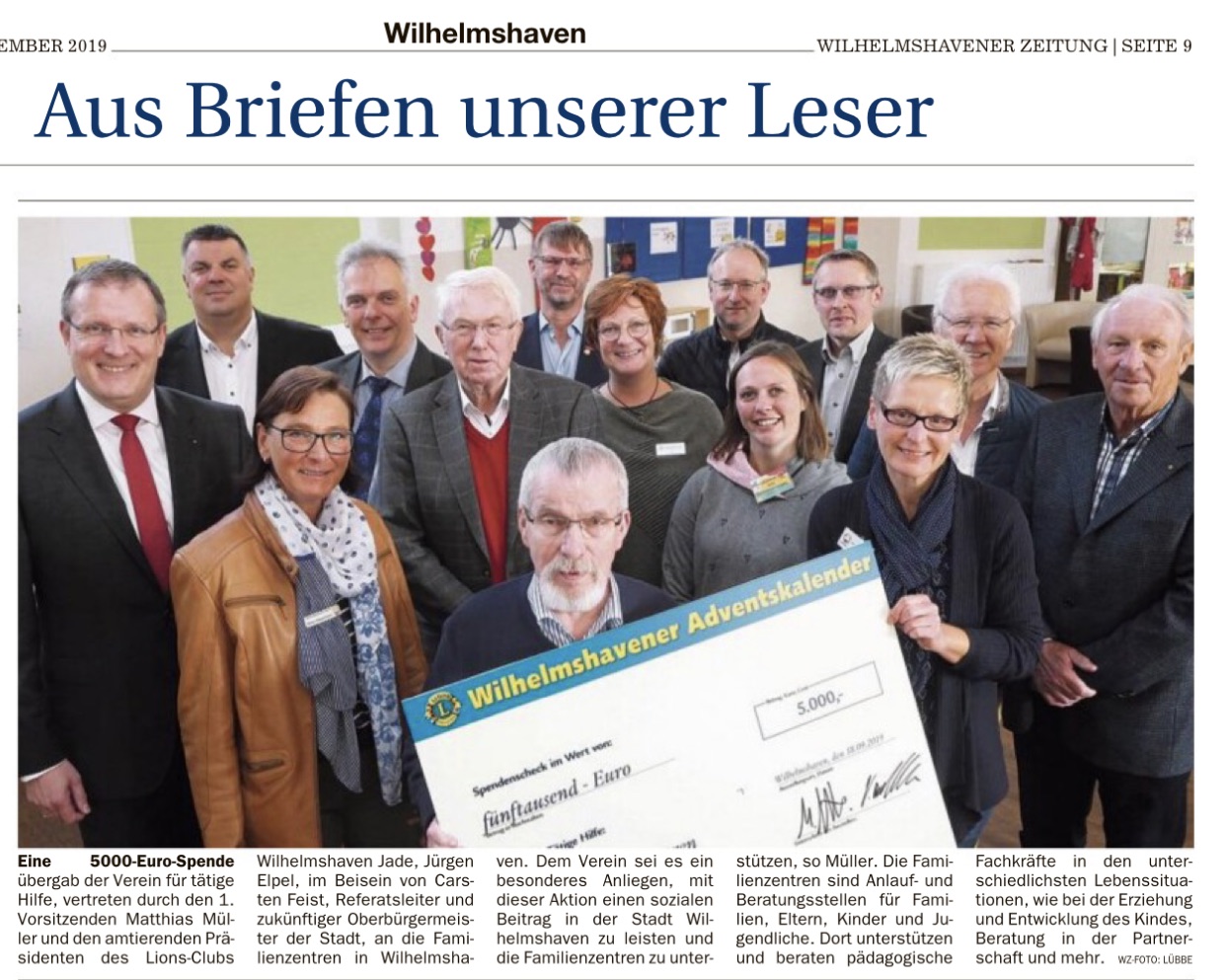 Eine 5.000-Euro-Spende übergab der Verein für tätige Hilfe, vertreten durch den 1. Vorsitzenden Matthias Müller und den amtierenden Präsidenten des Lions-Clubs Wilhelmshaven-Jade, Jürgen Elpel, im Beisein von Carsten Feist, Referatsleiter und zukünftiger Oberbürgermeister der Stadt, an die Familienzentren in Wilhelmshaven. Dem Verein sei es ein besonderes Anliegen, mit dieser Aktion einen sozialen Beitrag in der Stadt Wilhelmshaven zu leisten und die Familienzentren zu unterstützen, so Müller. Die Familienzentren sind Anlauf- und Beratungsstellen für Familien, Eltern, Kinder und Jugendliche. Dort unterstützen und beraten pädagogische Fachkräfte in den unterschiedlichsten Lebenssituationen, wie bei der Erziehung und Entwicklung des Kindes, Beratung in der Partnerschaft und mehr.