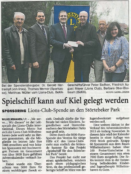 Denn durch die 5.000-Euro-Spende des Vereins für tätige Hilfe e.V. des Lions-Clubs steht nun endlich die fehlende Summe für das Projekt „Spielschiff für den Störtebeker Park“ bereit.